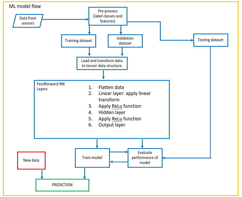 The ML network uses just one hidden layer as described in the paper. I have found other readings which apply an ensemble of networks to image datasets that show dramatically improved prediction accuracy results. As the model stands right now, an ensemble approach with a larger dataset from 8+ sensors may be helpful in modelling the time series dataset I’ve built for this experiment.
