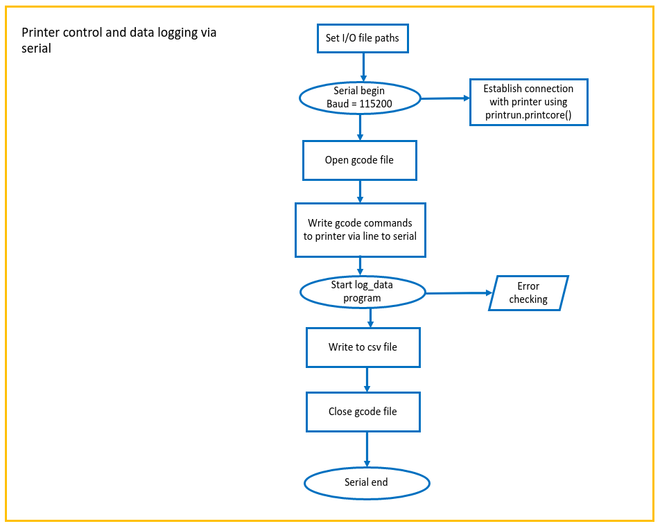 Although the library is robust in its features offered, for this experiment’s purposes, only the printcore class was used to gain access to the core control methods. In addition to that, I wrote a short program to interface with printcore via serial, Arduino via serial, and a custom data logging program to capture the data streaming into the serial port. Details are below and the code will be published via Github.